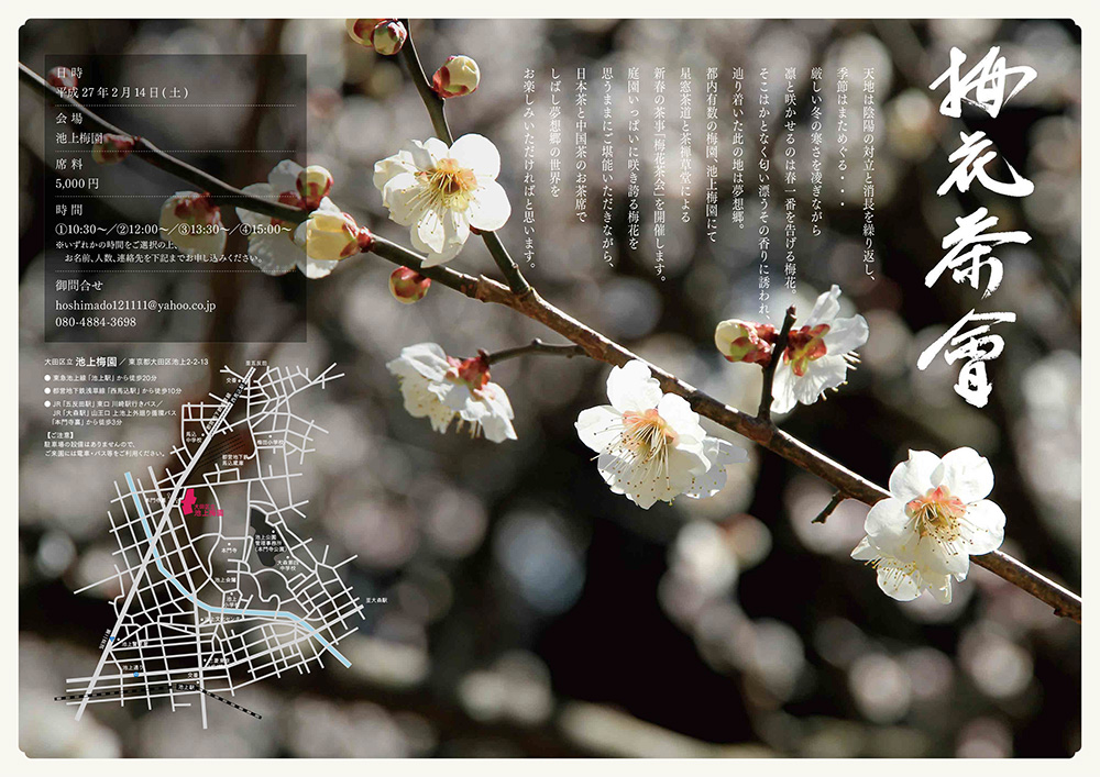 そこはかとなく匂い漂うその香りに誘われ、辿り着いた此の地は夢想郷。都内有数の梅園、池上梅園にて星窓茶道と茶禅草堂による新春の宴「梅花茶會」を開催します。