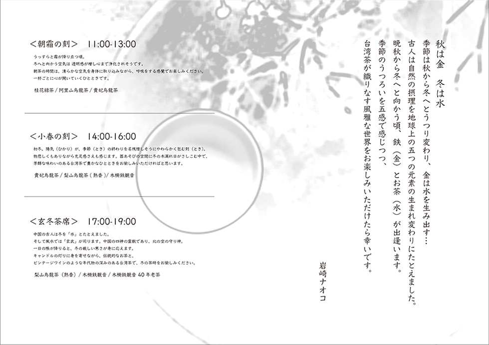 季節のうつろいを五感で感じつつ、台湾茶が織りなす風雅な世界をお楽しみいただけたら幸いです。